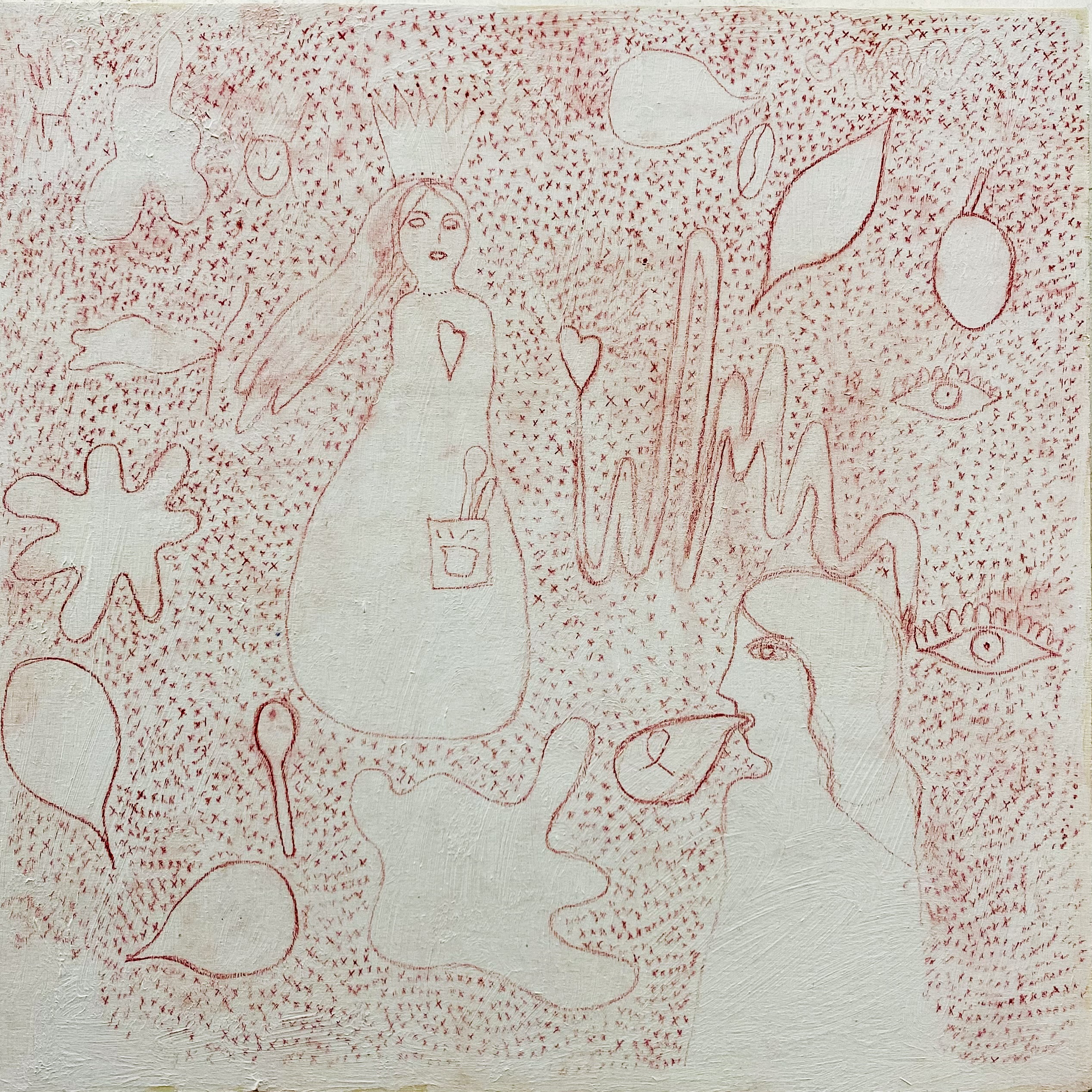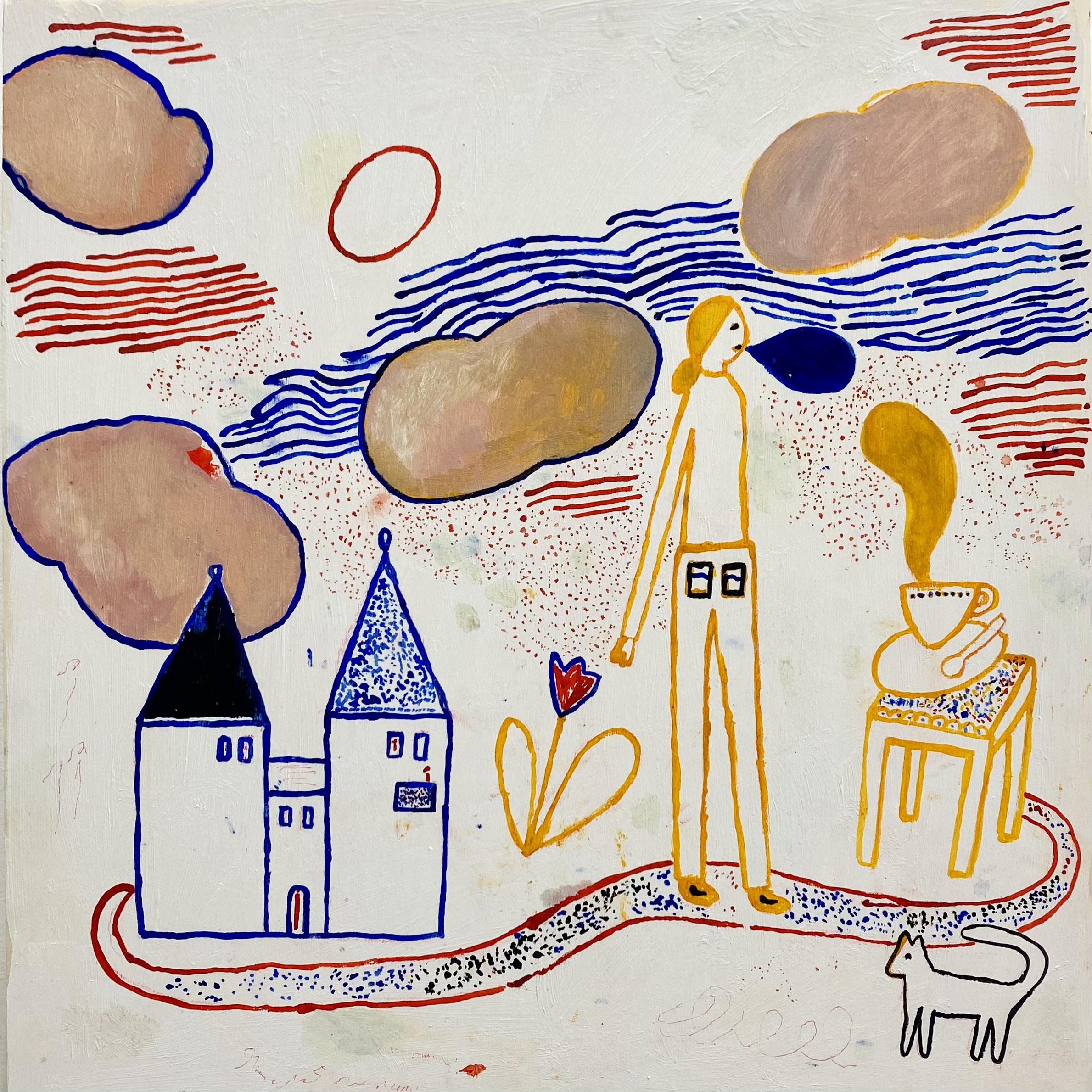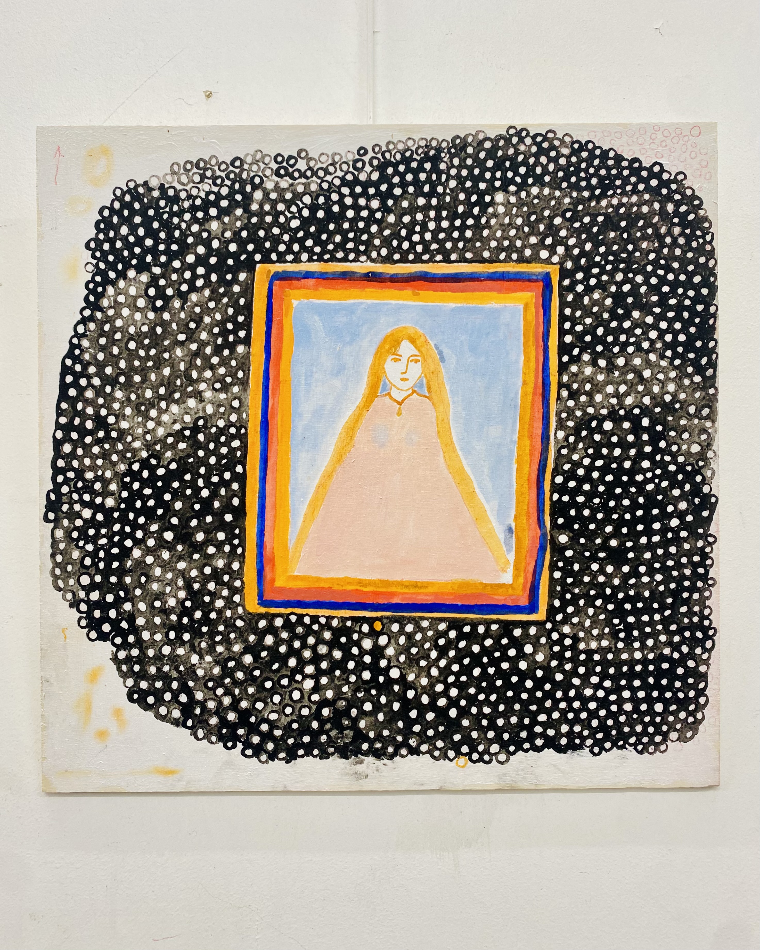 In seiner dritten DURCHFAHRT-Ausstellung zeigte Max rund 20 Arbeiten aus der 2024 begonnenen Reihe von Malereien und Pinselzeichnungen (Öl/Holz) im fast quadratischen Format, ergänzt durch Arbeiten auf Papier und hinter Glas. Die figürlichen Motive erscheinen lebendig - mal wie frei collagiert oder aneinandergereiht, mal räumlich, mal flächig angeordnet, dann wieder als einzelne Figur herausgehoben oder in Landschaftliches oder Ornamentales verwoben.